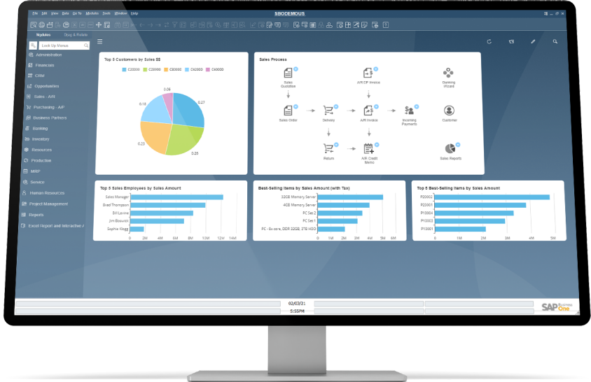 SAP Business One is an affordable solution to manage small and midsize companies: from accounting and financials, purchasing, inventory, sales and customer relationships (CRM) to reporting and analytics.This software for a small business encompasses a wide range of functionalities essential for the effective management and growth of small to midsize enterprises (SMEs).